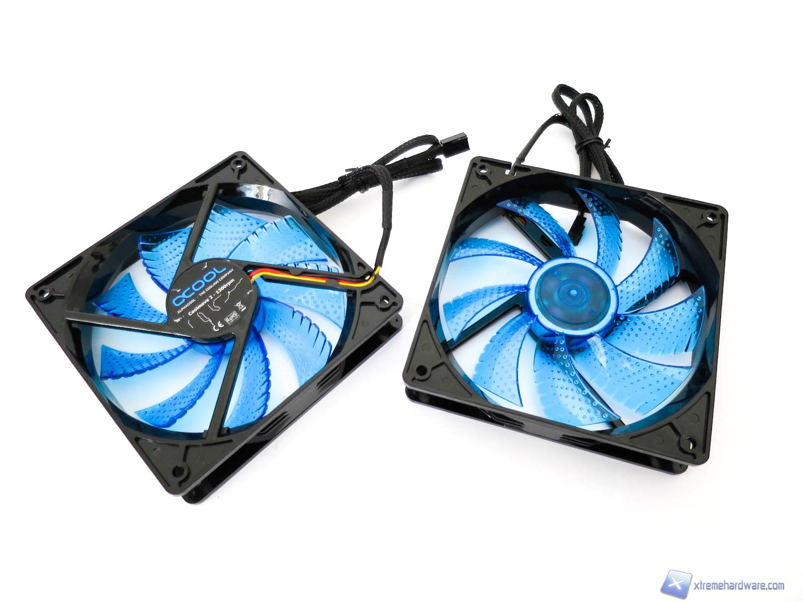 Con l’Alphacool Eisberg ci vengono fornite in bundle due ventole da 120 millimetri con spessore di 20 millimetri e connettore a 3 pin. Come vediamo le ventole hanno un design davvero particolare specialmente la struttura delle pale.